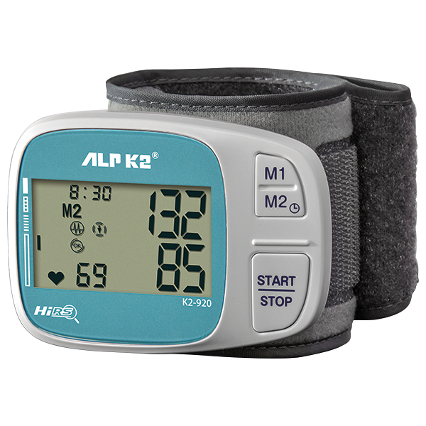 Monitor de presión arterial digital ALPK2® K2-920. Mide durante inflado. Sistólica 50-250mmHg, diastólica 40-180mmHg, pulso 30-199bpm. Función memoria, peso 100g.