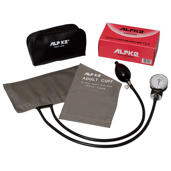 ALPK2® アネロイド血圧計 NO.500-V。測定範囲20-300mmHg、精度±3mmHg。マジックテープ腕帯、ゼロストップピン付き、重量430g。