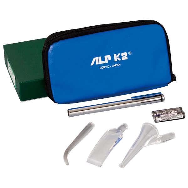 ALPK2® E.NT診断セット NO.1000-B。ペンライト、鼻・舌圧・耳用イルミネーター付き。単4電池2本、重量196g。