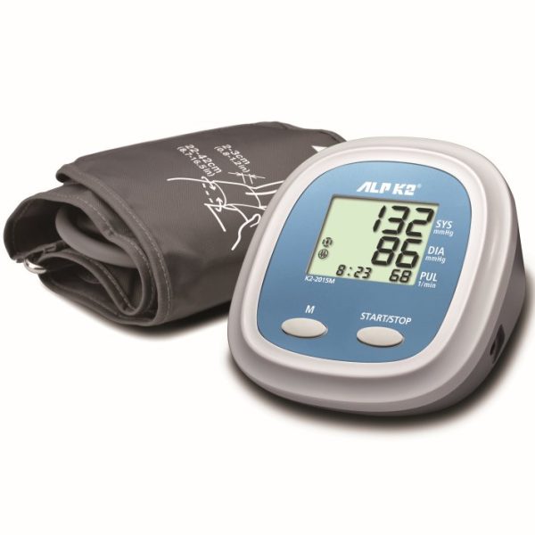 ALPK2® デジタル血圧計 K2-2015M。腕周囲22-42cm対応。収縮期50-250mmHg、拡張期40-180mmHg、脈拍40-180bpm。メモリー機能、重量220g。